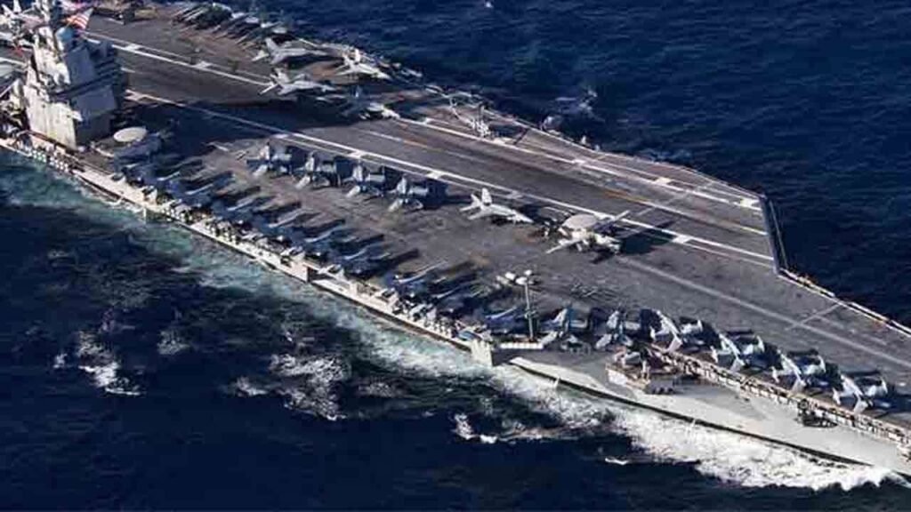 USS Gerald R Ford என்று பெயரிடப்பட்ட இந்த விமானம் தாங்கி கப்பல், 90 விமானங்கள் வரை கொண்டு செல்லக்கூடிய உலகின் மிகப் பெரிய அமெரிக்கப் போர்க் கப்பலாகும்.