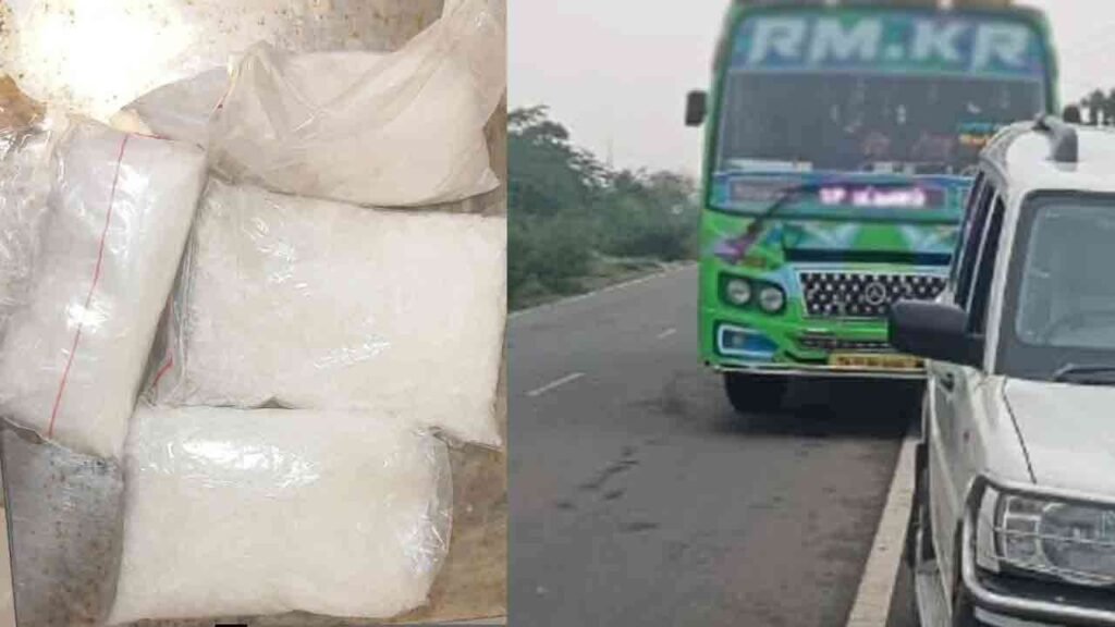 அப்போது, மீமிசல் பேருந்து நிலையத்தில் இருந்து தொண்டி நோக்கி வந்த தனியார் பேருந்து ஒன்றை எஸ்.பி. பட்டினம் அருகே வைத்து சுங்கத்துறை அதிகாரிகள் தடுத்து நிறுத்திச் சோதனை செய்தனர். பயணிகளின் இருக்கைக்குக் கீழே கேட்பாரற்றுக் கிடந்த பேக் ஒன்றைச் சோதனையிட்டபோது, அதில் ஐஸ் போதைப்பொருள் இருந்தது தெரியவந்தது.