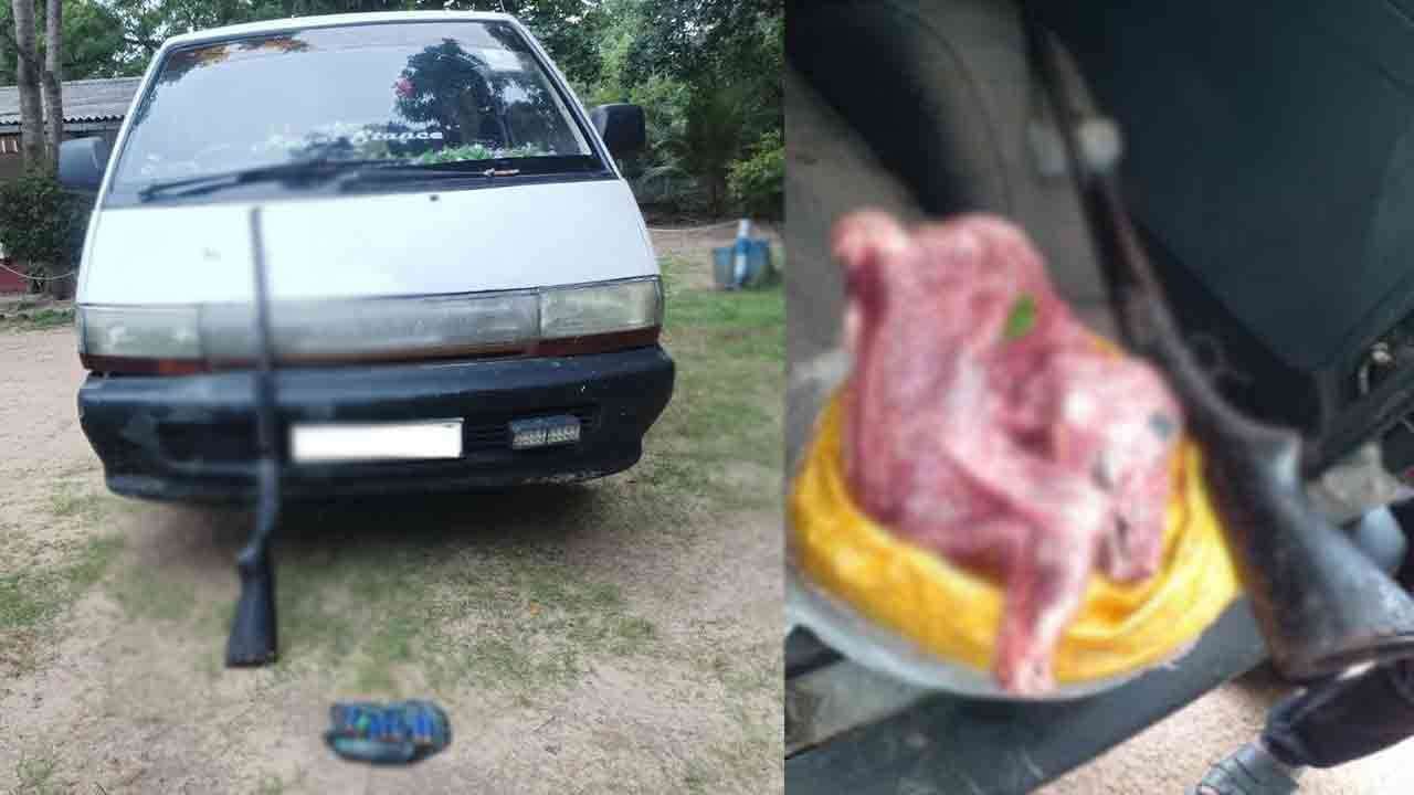 இதன்போது சந்தேக நபர்களிடமிருந்து துப்பாக்கி, தோட்டாக்கள் மற்றும் மான் இறைச்சி என்பன மீட்கப்பட்டுள்ளதுடன், அவர்கள் பயன்படுத்திய வேன் மற்றும் மோட்டார் சைக்கிள் என்பனவும் கைப்பற்றப்பட்டுள்ளன.