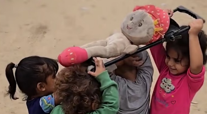 இஸ்ரேல் தாக்குதலால் கடுமையாக பாதிக்கப்பட்டுள்ள காசா நகரில் வாழும் மழலைகள் பொம்மைக்கு இறுதிச் சடங்கு செய்வதுபோல் விளையாடிய வீடியோ இப்போது உலகளவில் சமூக வலைதளங்களில் பரவி கவனம் பெற்றுள்ளது.