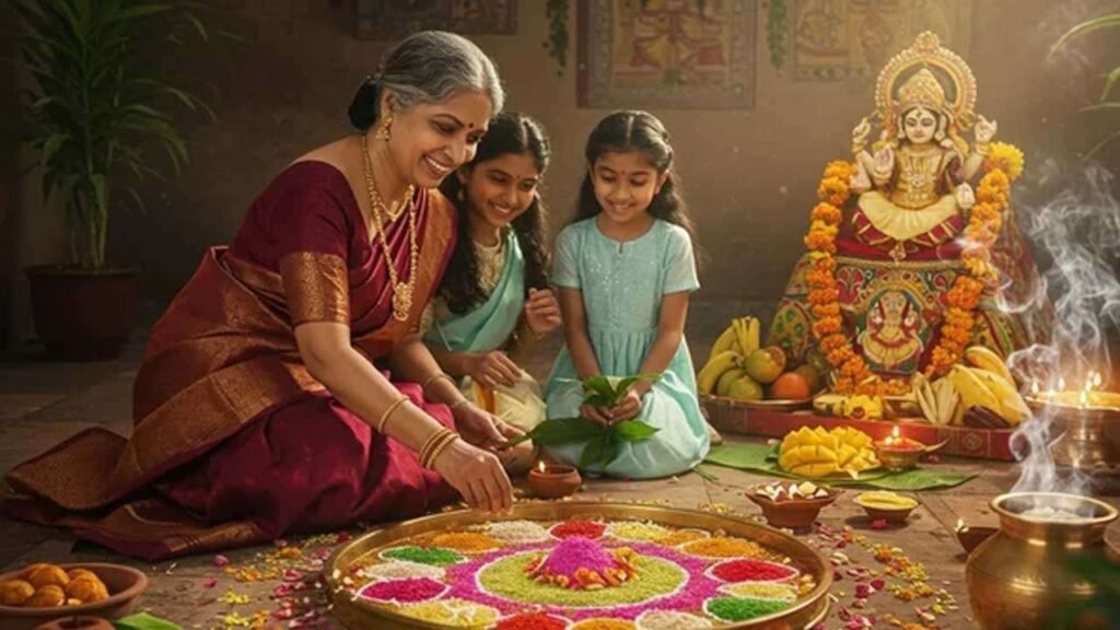 புத்தாண்டு தினமான இன்று அதிகாலையில் விழித்ததும் முதலில் மங்களகரமான பொருட்களைப் பார்ப்பது வழக்கம். தங்கம், வெள்ளி, பணம், முக்கனிகள் (மா, பலா, வாழை), பூக்கள் மற்றும் கண்ணாடி அடங்கிய தட்டை முதல் நாள் இரவே தயார் செய்து வைத்து, காலையில் அதைப் பார்ப்பார்கள்.