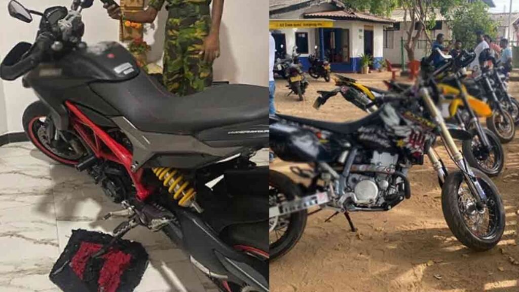 இவ்வாறு பறிமுதல் செய்யப்பட்ட மோட்டார் சைக்கிள்கள், நாட்டிற்குள் கொண்டு வர தடை செய்யப்பட்ட 800 மற்றும் 400 எஞ்சின் திறன் கொண்ட நான்கு மோட்டார் சைக்கிள்கள் என்றும், எவ்வித ஆவணங்களும் இல்லாமல் மறைத்து வைக்கப்பட்டிருந்த 250 எஞ்சின் திறன் கொண்ட ஒரு மோட்டார் சைக்கிளும் இருப்பதாக தெரிவிக்கப்படுகிறது.