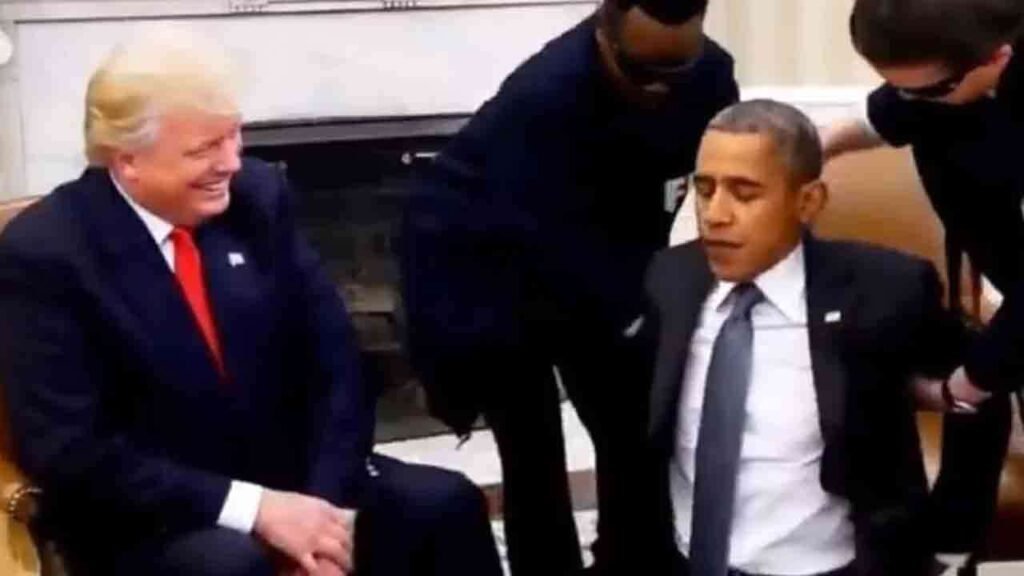 வீடியோ, ஒபாமா டிரம்புடன் பேசிக் கொண்டிருந்தபோது அதிகாரிகள் அவரை வலுக்கட்டாயமாக அழைத்துச் செல்வதை காட்டுகிறது. பின்னர் ஆரஞ்சு நிற உடை அணிந்து ஒபாமா சிறைச்சாலையில் இருப்பதையும் இந்தக் காட்சிகள் காட்டுகின்றன.