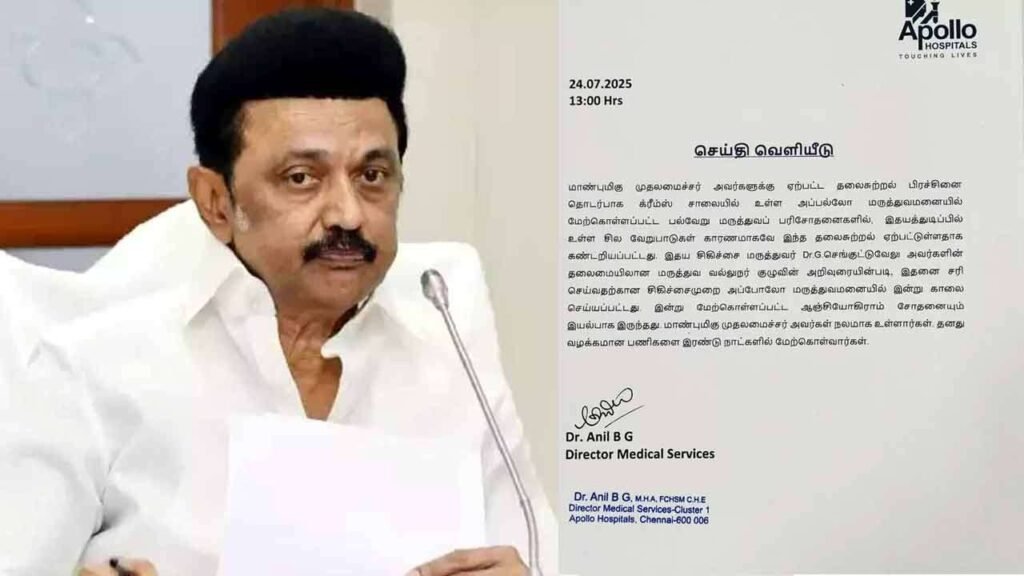 இந்த நிலையில், முதலமைச்சர் மு.க.ஸ்டாலின் உடல்நிலை குறித்து அப்பலோ வைத்தியசாலை அறிக்கை வெளியிட்டுள்ளது. அந்த அறிக்கையில்,
